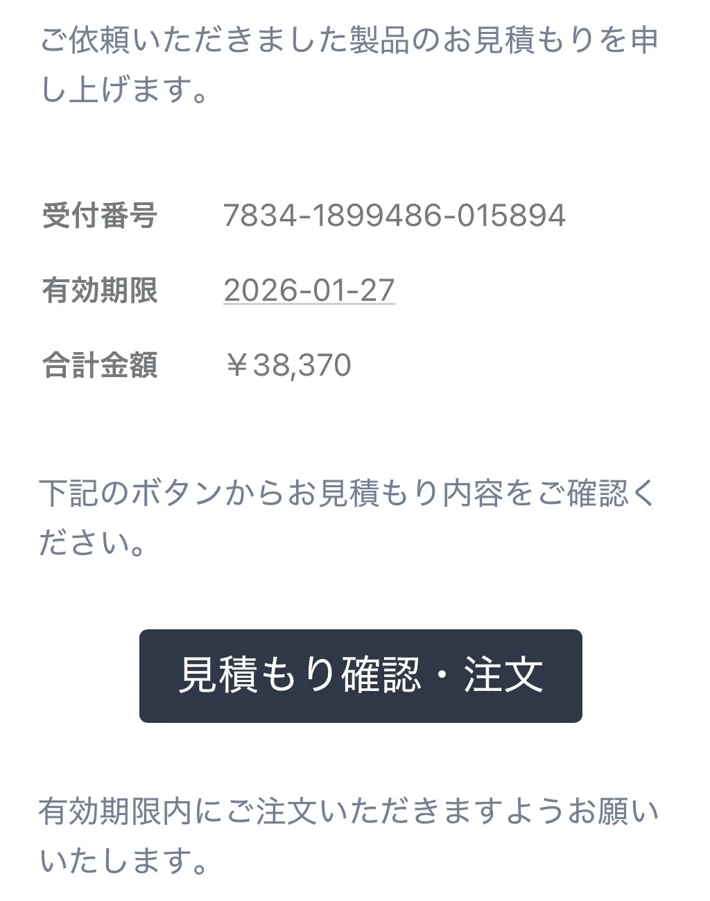 メールに内にある「見積もり確認・注文」ボタンを押下し、「見積の詳細」ページを開いてください。